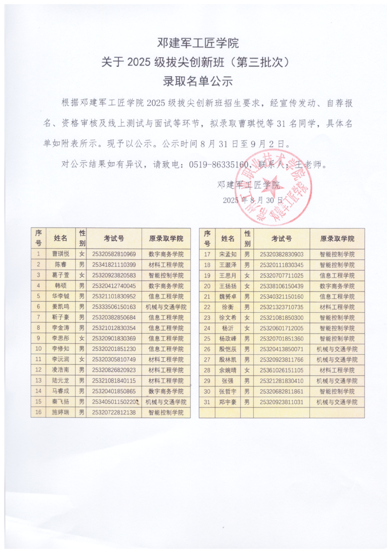 【录取公示】关于2025级拔尖创新班(第三批次)录取名单公示