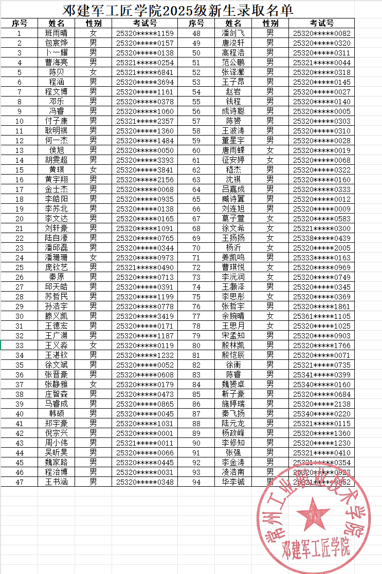 根据邓建军工匠学院2025级拔尖创新班招生要求,经宣传发动、自荐报名、资格审核、线上测试与面试及网上录取公示等环节,正式录取班雨晴等94名同学,具体名单如附表所示。